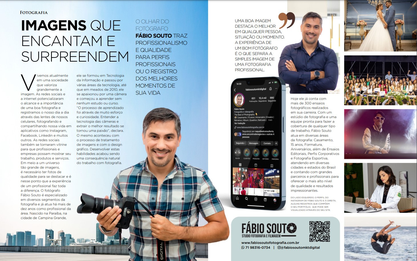 De fotógrafo apaixonado por empresário, nossa trajetória é marcada por talento, inovação e reconhecimento. Premiado três vezes em eventos de prestígio em Salvador e São Paulo, consolidamos nossa posição como referência em fotografia e produção audiovisual no país. Nosso foco é oferecer um serviço de excelência ao cliente, com atendimento personalizado e soluções que elevam a presença de marcas no setor corporativo.